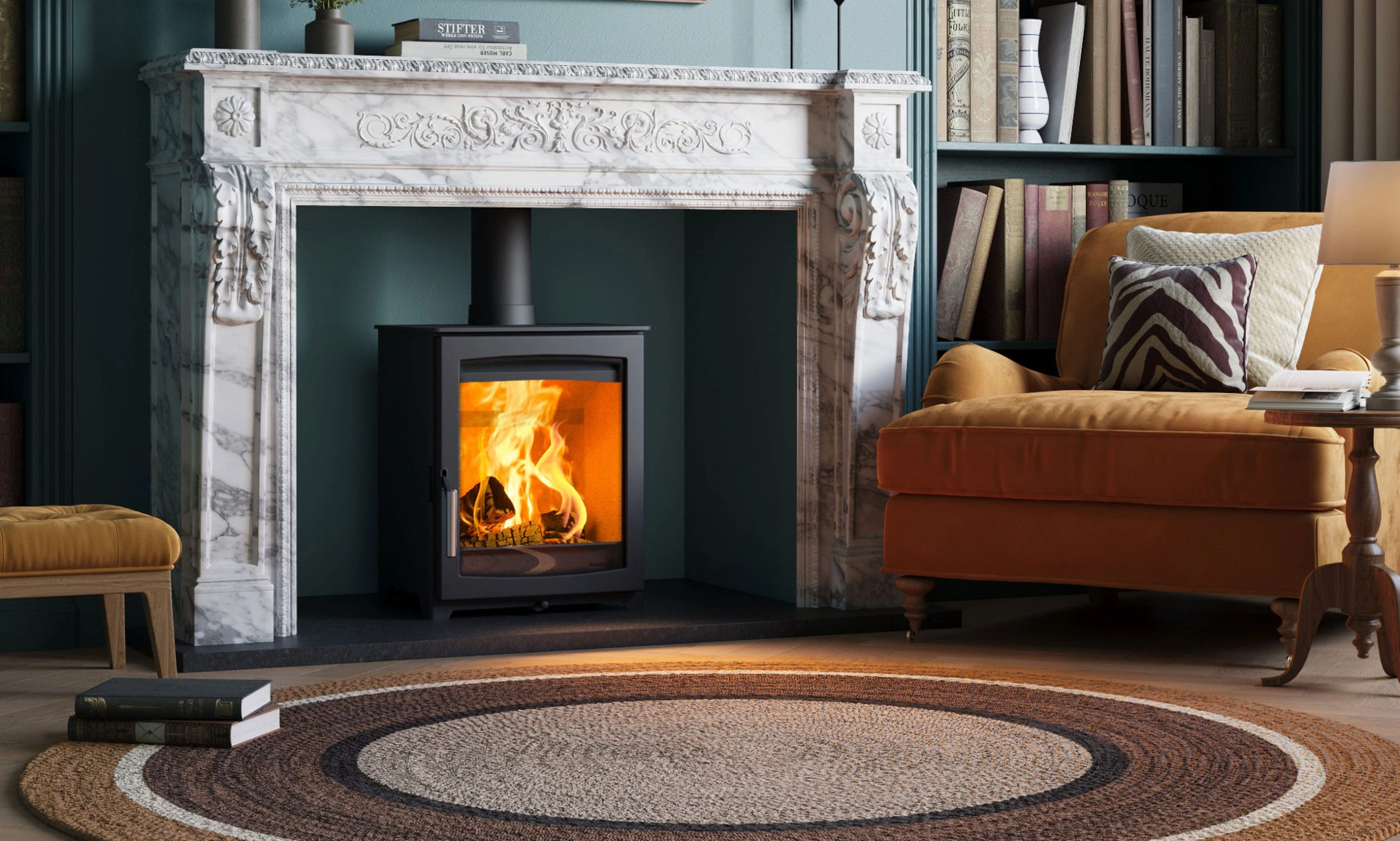 The Parkray Aspect 5 Eco is a stylish, eco-friendly wood-burning stove crafted in the UK by Hunter Stoves Group. With a peak output of 9.3kW and a low average output of 4kW, it combines powerful performance with high efficiency (72% Peak) and low emissions (0.7g/kg).